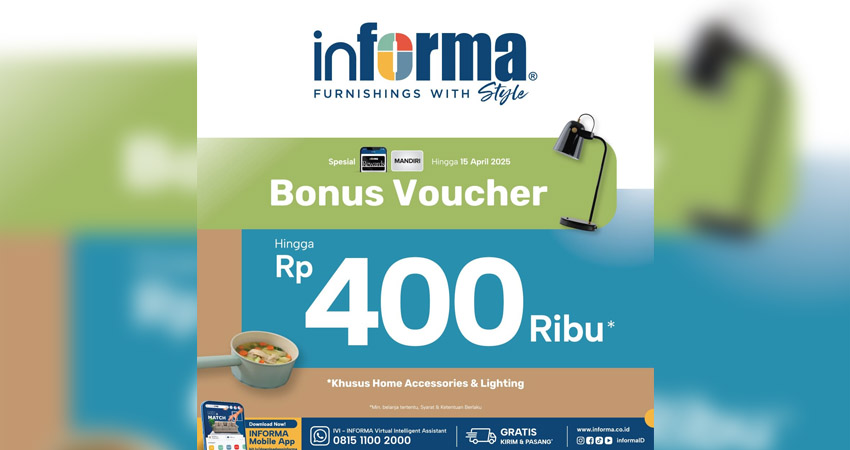 Tunggu apa lagi, mari manfaatkan promo yang sedang berlangsung sekarang di Informa Gorontalo yaitu promo bonus voucher cashback hingga 10juta dengan minimal belanja tertentu untuk perabot furnitur dan dapatkan bonus voucher cashback sebesar 400ribu untuk produk aksesories dengan belanja minimal tertentu syarat & ketentuan berlaku. (*/GP)