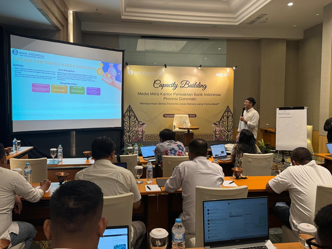 Selain media visit, Capacity Building media bersama Bank Indonesia juga dilakukan dengan pemaparan materi terkait kondisi ekonomi di daerah, yang disampaikan ekonom junior BI Gorontalo, M. Rafid Farhan, berlangsung di Hotel Tentrem Yogyakarta. Farhan menggambarkan kondisi inflasi, pertumbuhan ekonomi, hingga isu-isu ekonomi makro seperti harga komoditi, suplay and deman, trend belanja, dan peran Bank Indonesia Gorontalo.