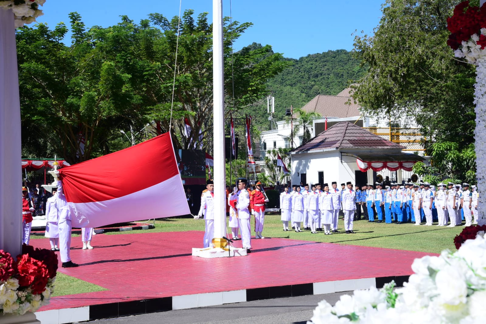 gorontalopost.co.id – Upacara peringatan detik-detik Proklamasi Kemerdekaan ke 80 Republik Indonesia tingklat Provinsi Gorontalo, yang berlangsung di halaman rumah dinas gubernur, Ahad (17/8), berlangsung khidmat dan sukses. Bertindak sebagai pembina upacara adalah Gubernur Gorontalo Gusnar Ismail, serta pembaca teks proklamasi adalah Ketua DPRD Provinsi Gorontalo, Idrus Thomas Mopili.