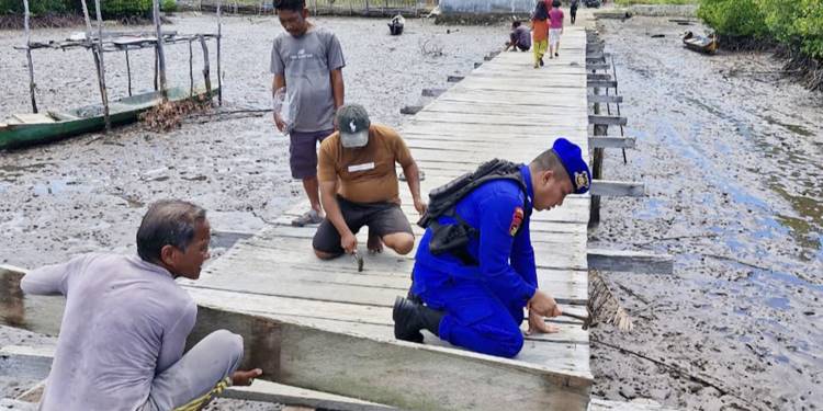 Bahkan, sempat mengalami kerusakan pada beberapa bagian papan lantai, sehingga membahayakan warga yang melintas. Melihat kondisi tersebut, personel Dit Polairud bergerak cepat turun langsung membantu proses perbaikan bersama warga.