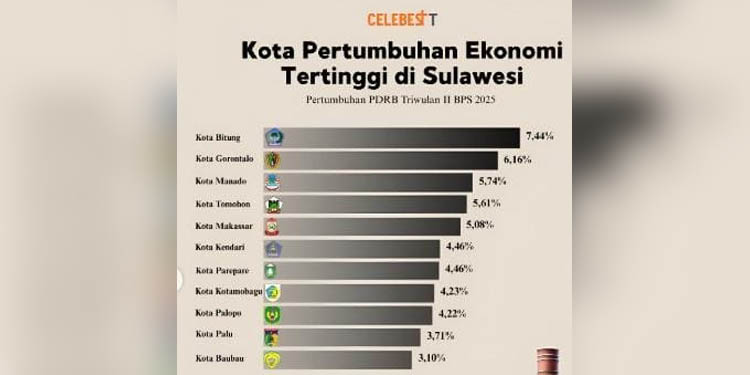 Menariknya, data tersebut menempatkan Kota Gorontalo di posisi kedua dengan pertumbuhan ekonomi mencapai 6,16 persen mengungguli dua kota besar, yakni Makassar dan Manado. Di urutan pertama ditempati Kota Bitung dengan pertumbuhan ekonominya di angka 7,44 persen.