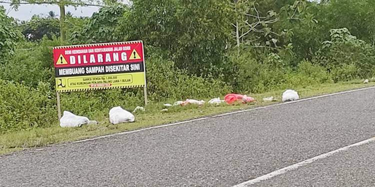 Gorontalopost.co.id, GORONTALO — Larangan membuang sampah di jalan GORR diabaikan warga. Terbukti meski telah dipasangi baliho yang bertuliskan larangan membuang sampah hingga denda, justru di dekat baliho itu malah menjadi tempat pembuangan sampah.