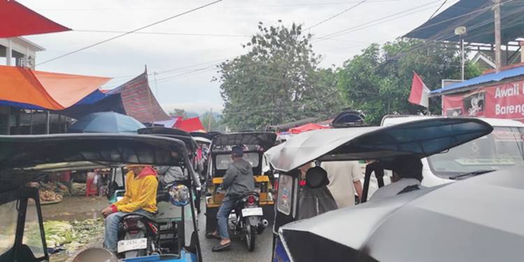 Pantauan Gorontalo Post, Rabu (7/1/2026), deretan Becak Motor (Bentor) diparkir di tengah ruas jalan dengan posisi dua jalur. Kondisi ini praktis memicu kemacetan arus lalu lintas ketika hari pasar tiba.