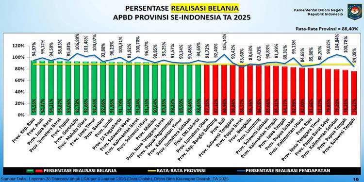Berdasarkan data Kementerian Dalam Negeri yang disampaikan dalam Rapat Evaluasi Realisasi APBD pada Senin, 12 Januari 2026, Pemprov Gorontalo berhasil menempati peringkat pertama nasional untuk realisasi pendapatan dengan persentase mencapai 106,89 persen. Sementara untuk realisasi belanja berada pada posisi keenam nasional dengan capaian 92,78 persen.