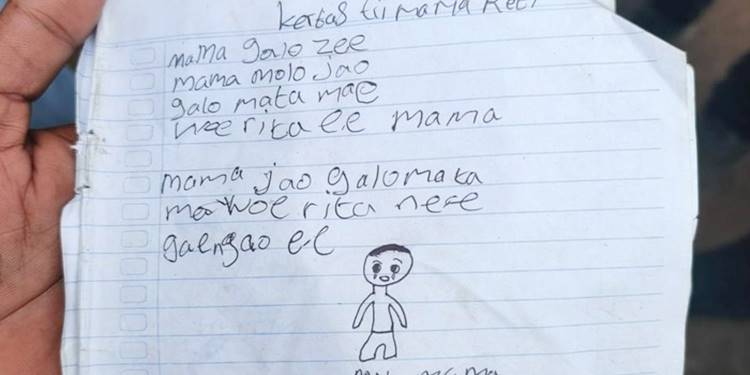 Surat kecil dari kertas lusuh itu, ditemukan Polisi saat mengevakuasi korban. Surat itu ditulis menggunakan bahasa daerah Nganda. Satu baris surat itu berisi ungkapan kekecewaan korban terhadap ibunya. Dalam surat itu, ia menyebut ibunya pelit. Selebihnya, surat itu berisi ungkapan perpisahan kepada ibunya.