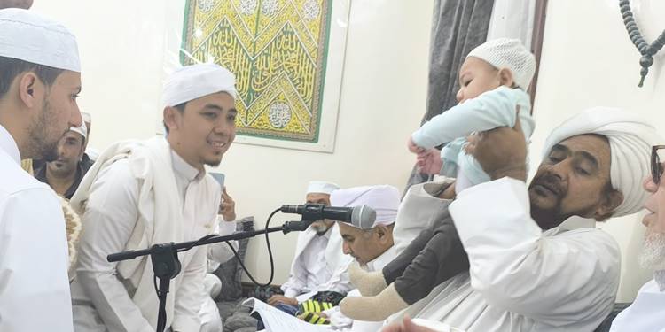 Lalu ada bayi dibawa bapaknya ke depan. Diserahkan ke Habib Umar. Dipangku. Dipegang dahinya. Didoakan. Dioleskan sesuatu ke bibir bayi itu. Lalu diserahkan ke ulama di sebelah saya. Didoakan lagi. Baru dikembalikan ke ayah si bayi.