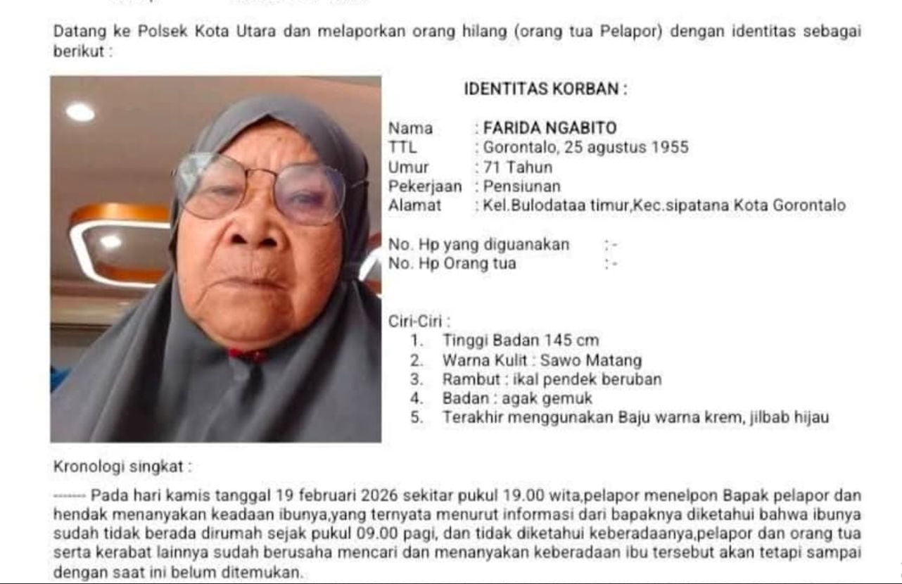 gorontalopost.co.id – Seorang perempuan lanjut usia, Farida Ngabito berusia 71 tahun, warga Kelurahan Bulotadaa, Kecamatan Sipatana, Kota Gorontalo, dilaporkan hilang oleh pihak keluarganya sejak Kamis 19 Februari 2026 yang lalu. Sudah hampir tiga pekan berlalu, Oma Farida belum diketahui keberadaanya. Pihak keluarga sudah mengadukannya ke Polisi agar bisa membantu menemukan orang tua mereka.