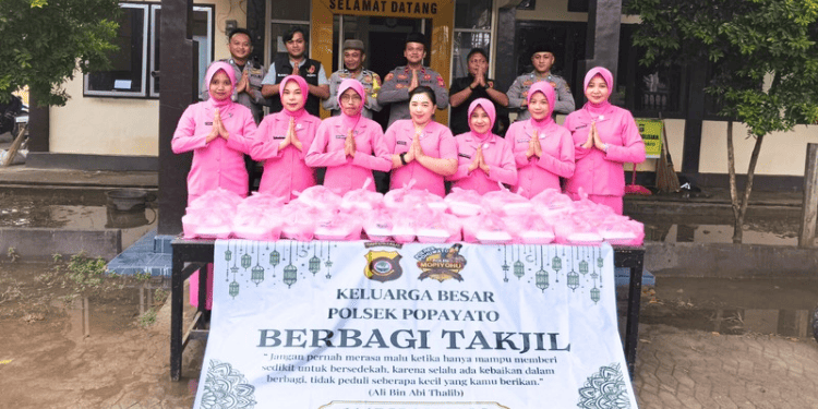 Pantauan Gorontalo Post Jumat (13/3) sekitar pukul 16.45 Wita, anggota Polsek Popayato beserta Pengurus Ranting Bhayangkari Polsek Popayato, yang dipimpin langsung oleh Kapolsek, IPDA Muhammad Kafin Adlan S.Tr.K. membagikan makanan takjil yang dipusatkan di Jalan Trans Sulawesi, tepatnya di depan Polsek Popayato. Pembagian takjil tersebut mendapatkan perhatian serta dukungan dari masyarakat sekitar, khususnya pengguna jalan.